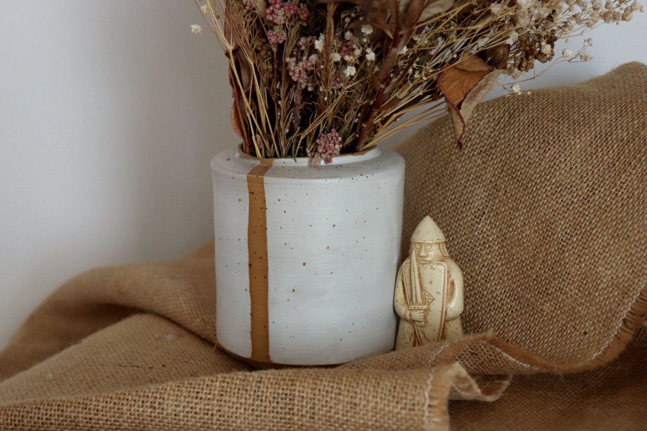 For the glazing, I dipped it almost-halfway in horizontally. This left an exposed stripe of clay along the body that went a beautiful toasted orange colour in the glaze kiln.